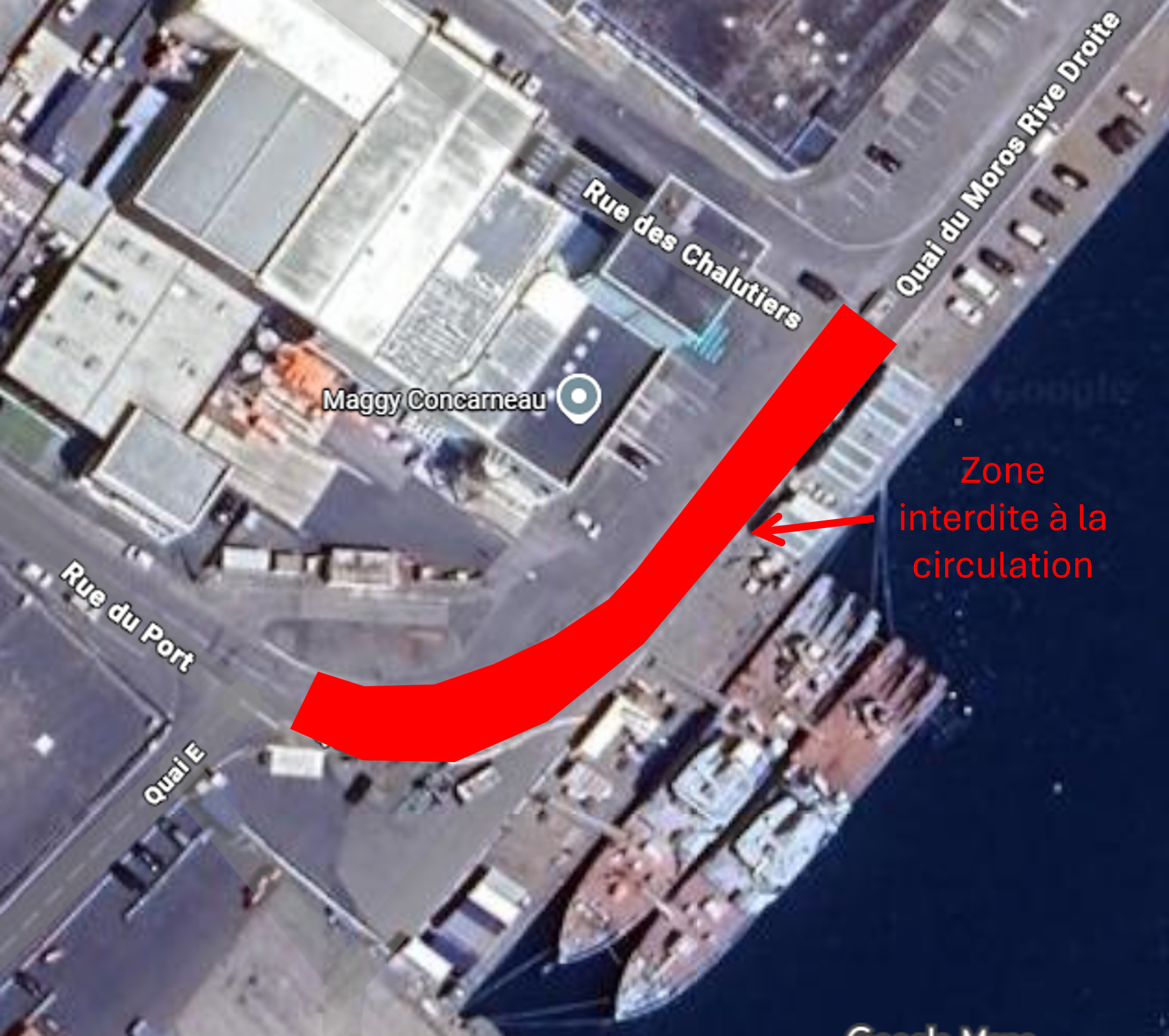 La circulation est interdite par un arrêté municipal ce jeudi 22/01 de 7h à 13h sur le quai du Moros rive droite de la rue du Port à la rue des Chalutiers.